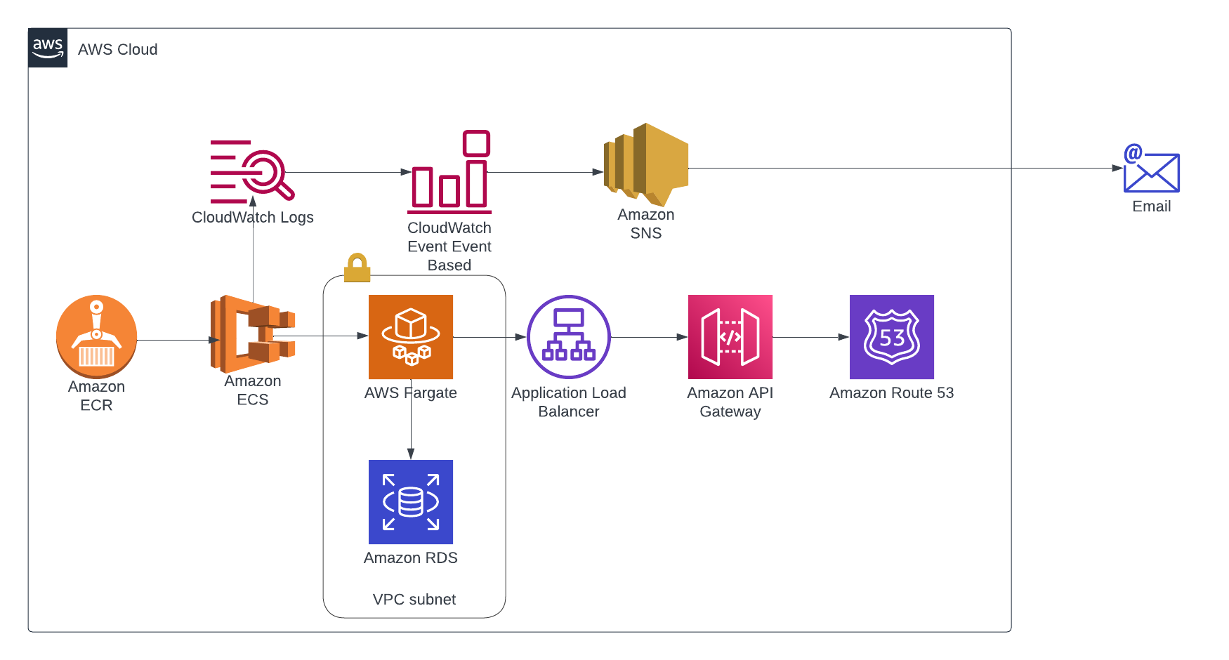 Powered by: AWS ECS with Fargate, AWS EventBridge, AWS VPC, Amazon SNS, Terraform, Github Actions